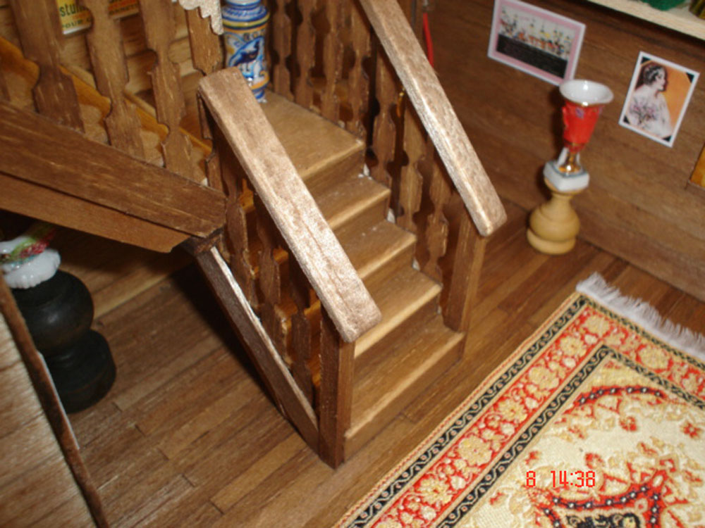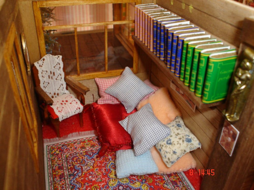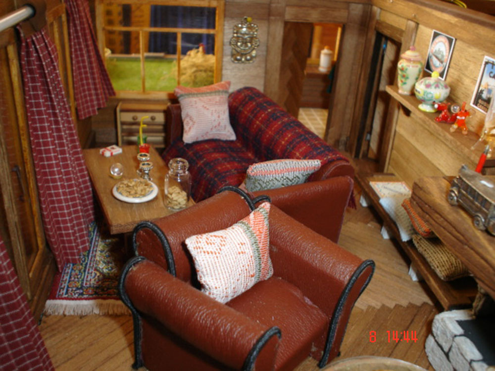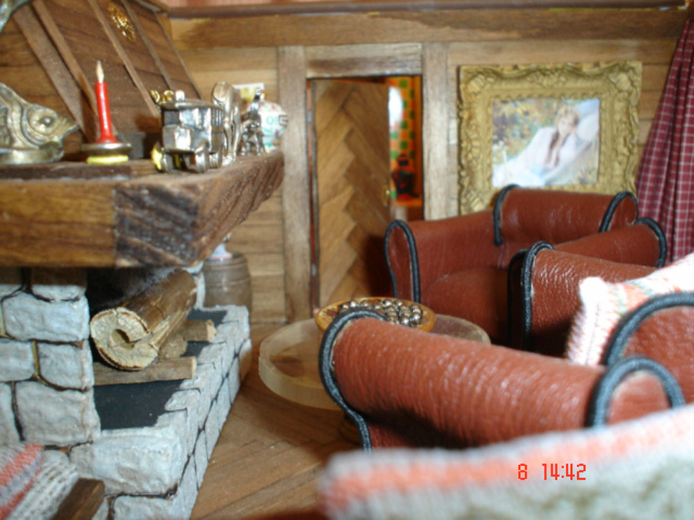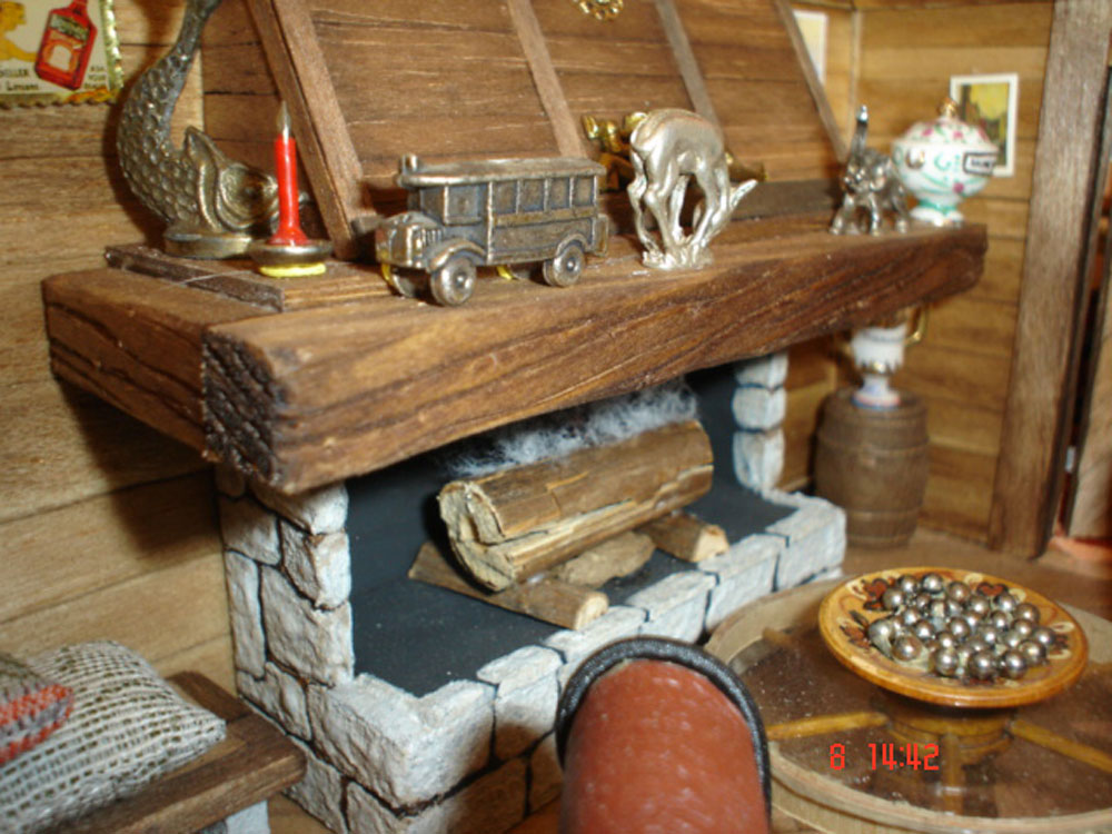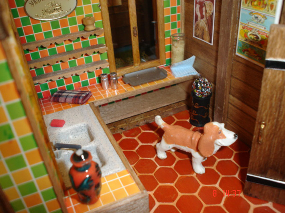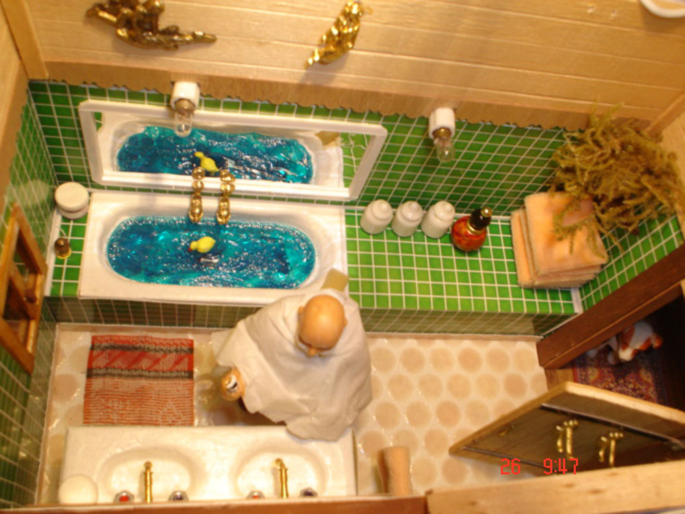 La baignoire et le lavabo sont réalisés dans des blocs de plâtre à modeler, creusés, poncés et peints.