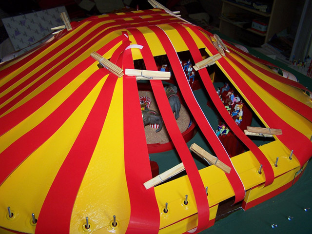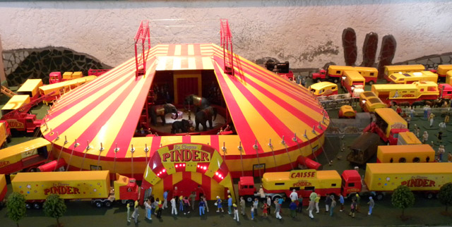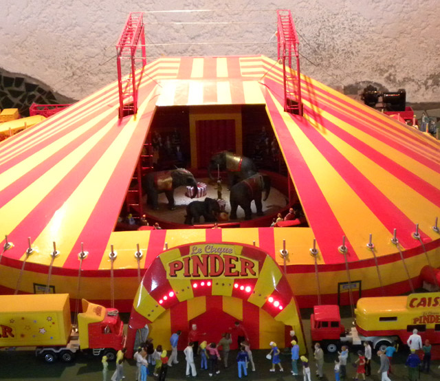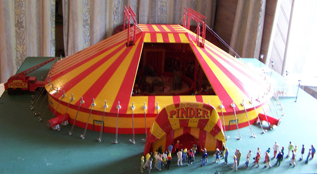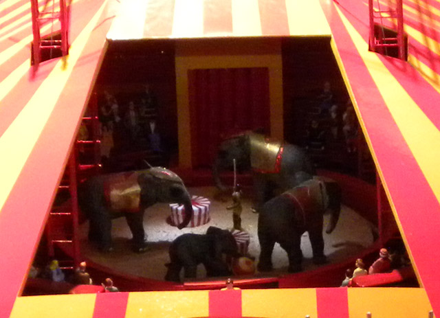 La musique et l'éclairage battent leur plein. Les éléphants tournent sur la piste centrale.