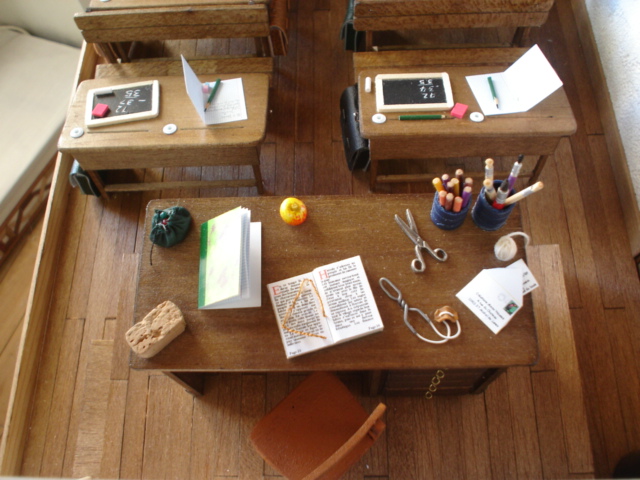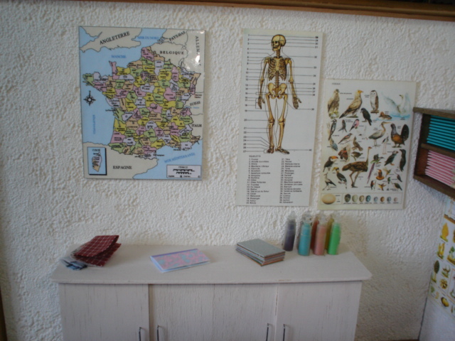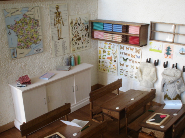 Vue sur le fond de la classe. La carte de France tient compte de l’époque quant aux noms de départements.
