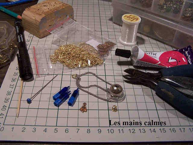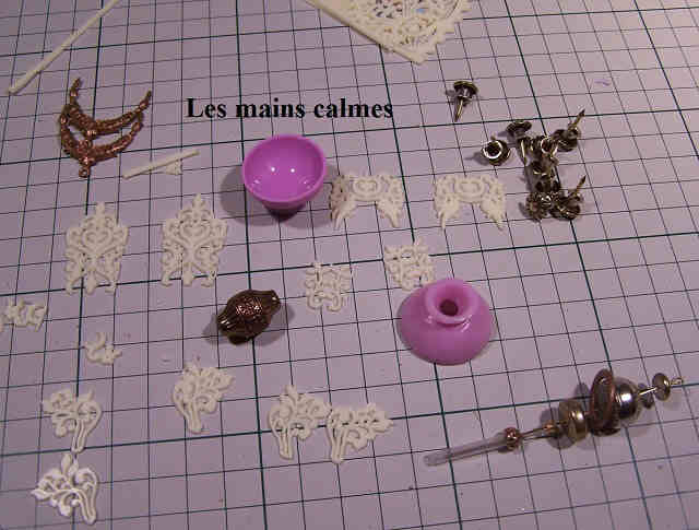 Des morceaux d'éventails en plastique, des clous de tapissier, de la pâte fimo et des perles en métal.